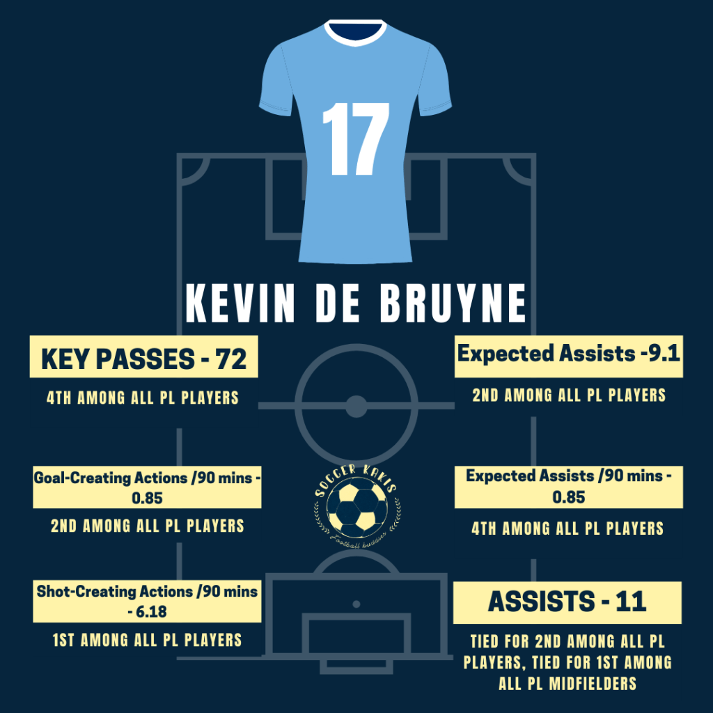 Kevin De Bruyne is still an absolutely phenomenal player, arguably still one of, if not the most talented player in the league. Five goals and 11 assists this season (with games left to play, remember) is still a great return and leaves him second among all Premier League players in assists, trailing Harry Kane by only two. And remember, De Bruyne missed nine games this season! These total numbers could be much better than they are now, and even then they are still very impressive.