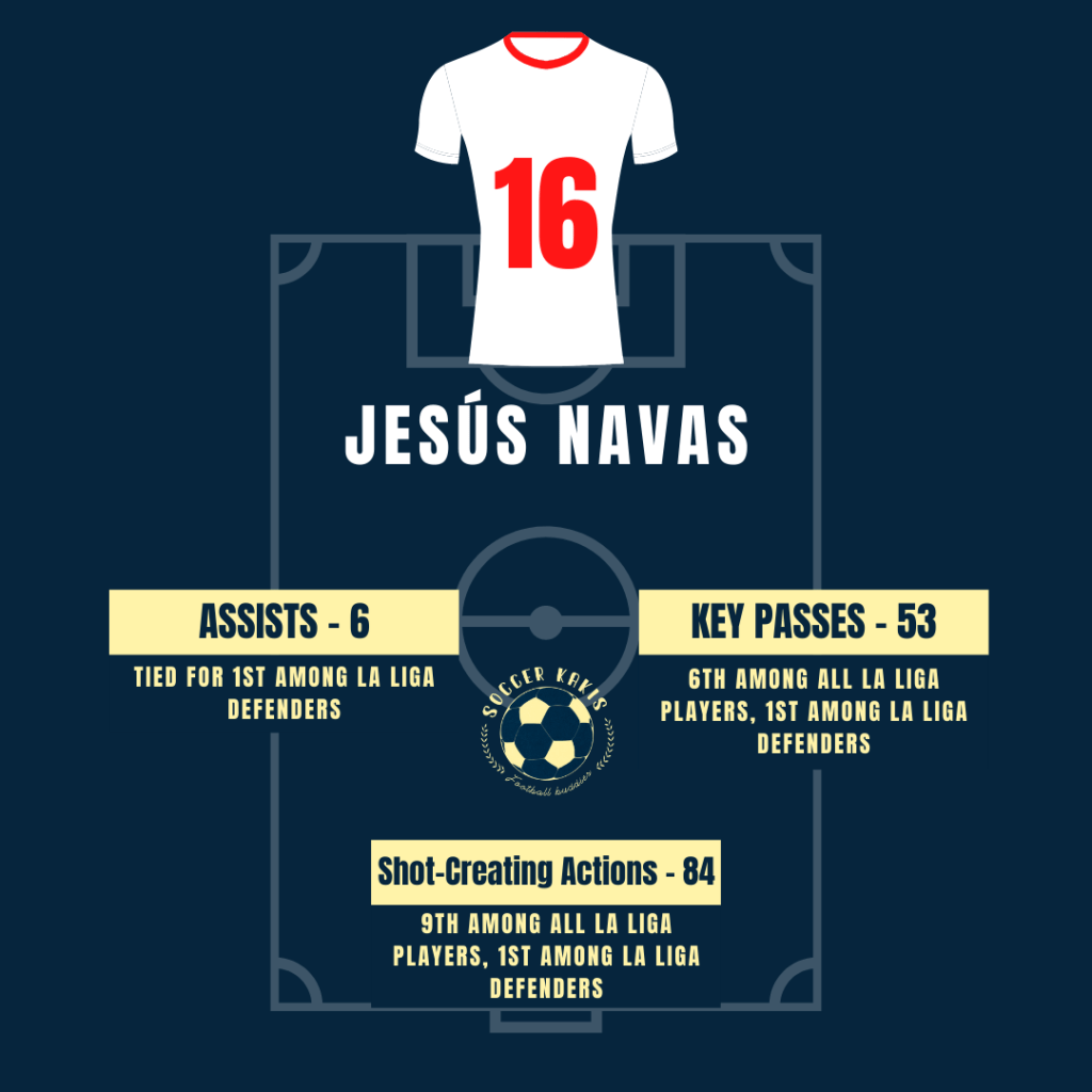 Navas is just a dependable and consistent player on both ends of the pitch. Continuing to defy Father Time, the boyhood Sevillista has performed fantastically as a converted right back, able to find enough energy to bomb up and down the pitch at the ripe age of 35. He has been very solid defensively, with a positional sense and tackling ability that is all the more impressive when you remember he was a winger only a few years ago. His greatest contributions to the Sevilla team, however, have come in attack. He has been a constant attacking presence on that right side, swinging in crosses like a madman. He is the joint-top assist provider among all defenders in LaLiga this season, as well as being in the top ten among all players for key passes and shot-creating actions. He also crosses the ball more than any player in LaLiga which, while it does not seem like an important stat in isolation, it does look very good when paired with his very impressive chance creation stats and probably explains why Sevilla striker Youssef En-Nesyri has the second most headed goals of any player in the league.