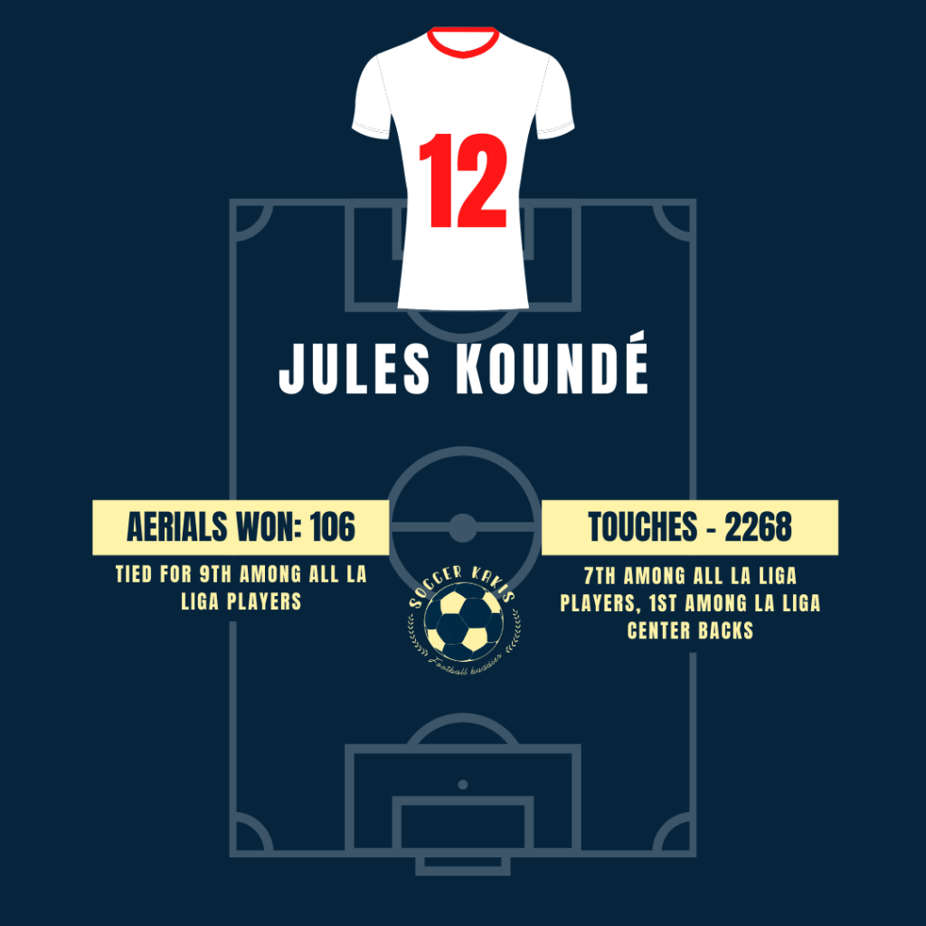 What is even more remarkable is Koundé’s physical ability relative to his size. The Frenchman has a listed height (listed on Sevilla’s website) of 1.78m, which is about 5’8″-5’9″. You could probably add an extra inch or two if he let his afro grow out a little longer, but even then that is quite small for a center back, especially at the top level in football. He really does not play like a small player, though, and you can see his ability to take advantage of a burst of acceleration, low center of gravity, and quite impressive jumping ability to fill the physical skill void needed by top tier center backs. He has won the tenth most amount of aerial duels of any player in La Liga, which is remarkable given his height. He is very much a Samuel Umtiti-type player, with Umtiti being listed at 1.82m (about 5’10”), able to use an incredibly developed football IQ paired with a strong jumping range and fearlessness to succeed in a position that is seemingly demanding taller and more physically built players. Another comparison, going back a few years, would be former Juventus center back and World Cup-winning captain Fabio Cannavaro, who was arguably the best center back in the world in 2006 despite being about the same height as Koundé.