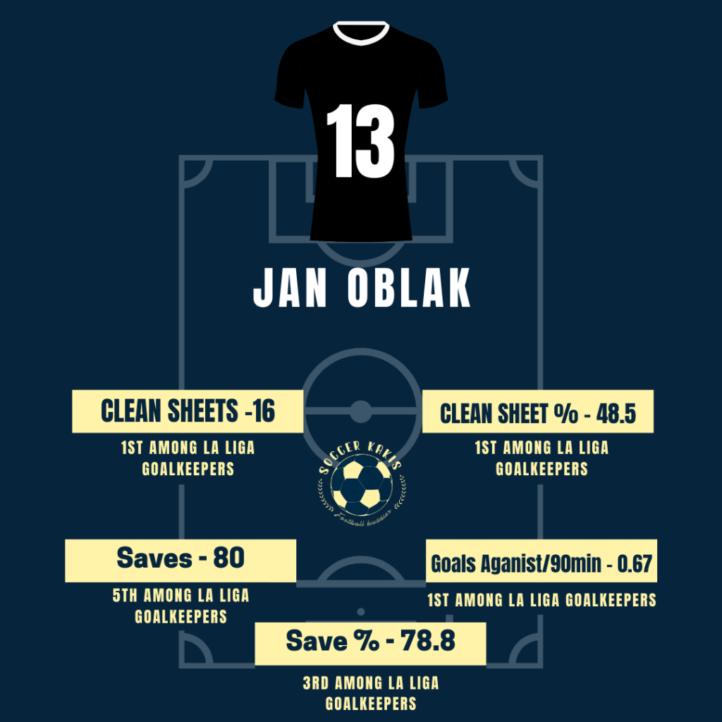 Now yes, this might be slightly contradictory to how I worked through the goalkeeper position for the Premier League team, choosing Emi MartÃnez over Ederson due to the Argentine doing more with a less solid defense in front of him, but I promise it is different here. It is not all about the numbers with Oblak, even if they are incredibly impressive. Yes, Atléti are a very defensive team, and they have been so historically under Diego Simeone, and that does contribute to Oblak’s very impressive clean sheet and goals against numbers, but that defense is much less solid than it has been before. Gone are the days where the likes of Diego GodÃn and Juanfran anchored a suffocating Atléti defense. Their defense now is not bad, and I think Mario Hermoso and Stefan Savić in particular have had very solid seasons, but Oblak is needed much more than before to bail Atléti out of trouble.