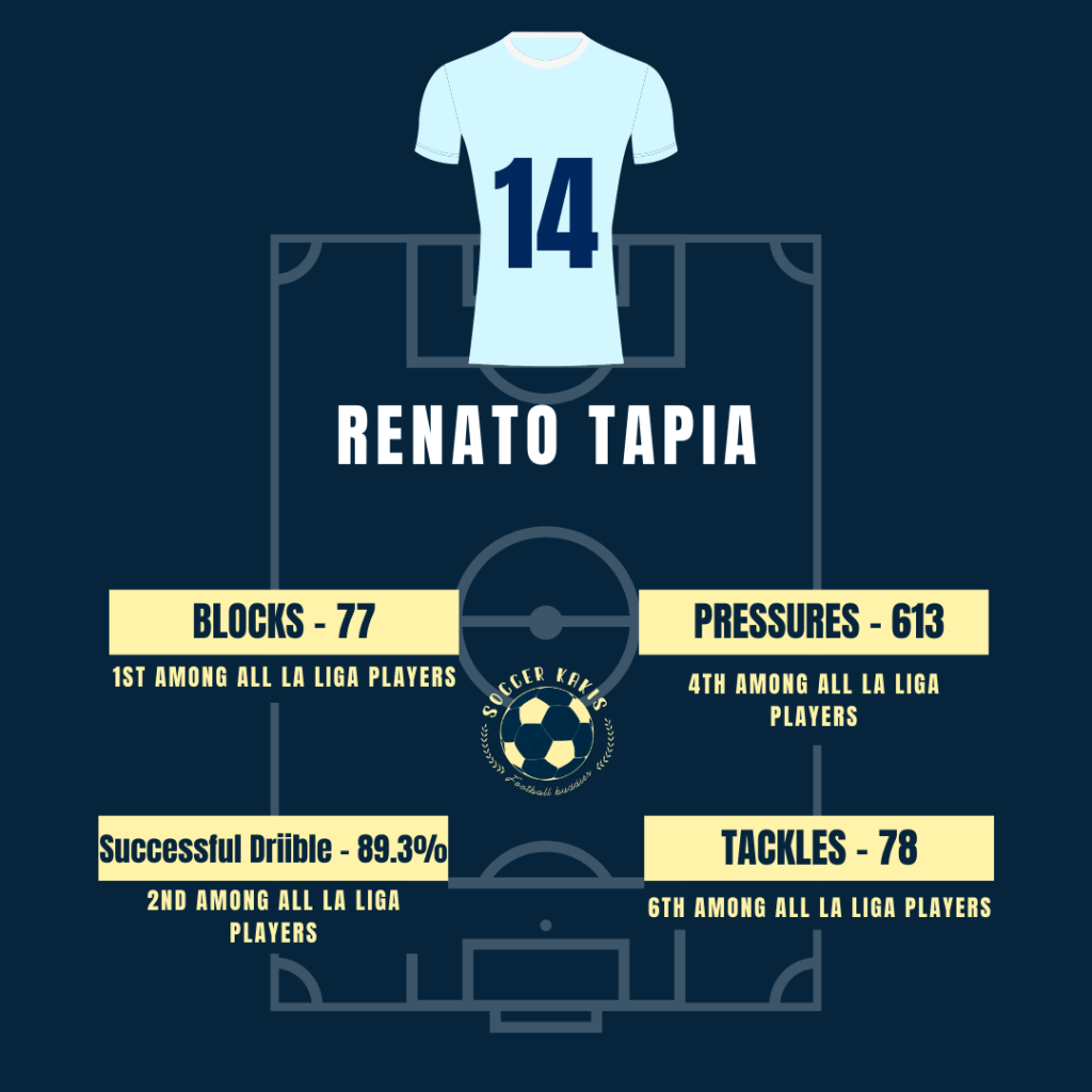 But I went a little out of left field. Celta Vigo are not a good team, although they are comfortably mid-table this season, which is an improvement on their relegation-fighting previous few seasons. They are more talented than previous years, and while they are definitely not good, they have more than one very good player. Maybe the most important thing that made Celta Vigo a halfway decent team this year was the addition of Renato Tapia, who joined the team on a free transfer from Feyenoord. He has since been a defensive force, putting in blocking, tackling, pressuring, and intercepting numbers that are frankly ridiculous. He is among the league leaders in all four of those categories while also being comfortable enough on the ball to be among the league leaders in successful dribbling percentage. That is quite a wild combination, and Tapia’s addition to the team has sured up a midfield and defense that is usually much worse than they were this season. It takes quite a talented player having a great season to beat out some of the big names I mentioned previously, and Tapia definitely fits the requirements. While the starting team was basically set, Tapia did enough to at least earn a spot here.