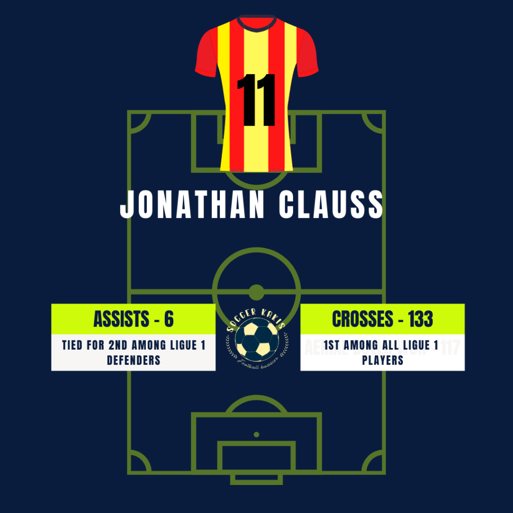 So how good is he as a player? Well, he is a relentless attacking fullback, playing as a wingback in Lens’ back five. His six assists this season is joint-second among all Ligue 1 defenders, and he has been able to add three goals to that tally as well. His never-ending energy allows him to cover that whole right side, but the biggest asset to his game is his ability to operate essentially as an extra attacker going forward. He makes intelligent runs and combines well with his teammates, as if he was playing as a winger at times, and his passing and crossing ability has led to many goal-scoring opportunities for his team. In a league that lacks high-level right backs, to be completely fair, Clauss stands at the top of a fairly non-competitive position. Despite this, he is still a great player and a great story.