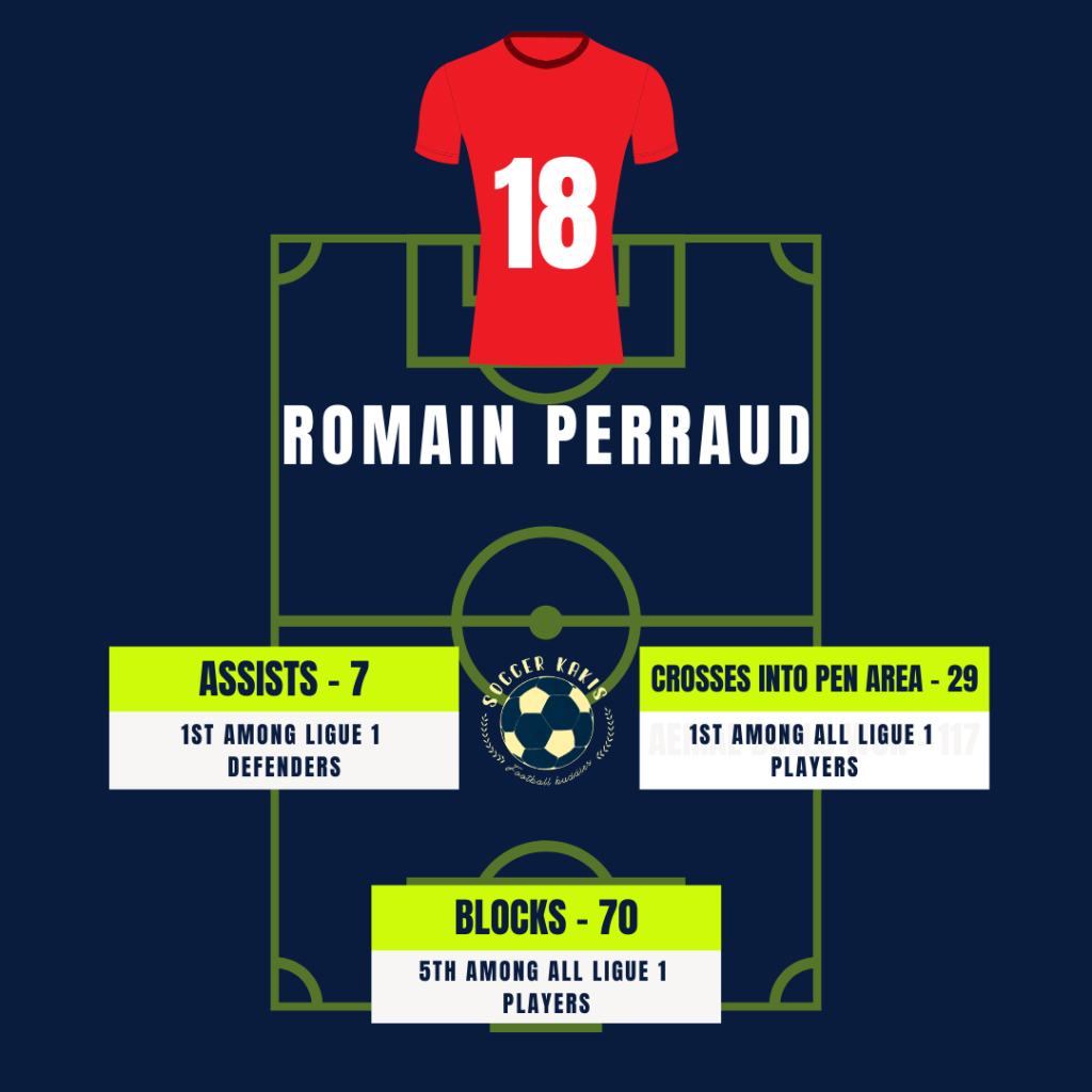 Romain Perraud, Brest’s fantastic flying attacking left back, is sort of the one truly great choice for this position. That does not mean he is not good, he clearly is one of the best creative players in the league, let alone among defenders. Brest have largely overachieved since arriving in Ligue 1, and while they are still at threat of relegation, it has been at least a fairly good season for the still-fairly-newly-promoted side. Perraud has been one of their best attacking players, bombing down the left side and being a very efficient player with the ball. His crosses are usually fairly effective, and, clearly shown by his seven assists, he is very good at getting the ball into dangerous areas. He is also a solid defender, being positionally solid and throwing himself into danger when needed to in order to stop crosses, passes, or shots. He is among the league leaders in blocks, which, while it is his only outstanding defensive statistic, does not fully highlight how solid of a defensive player he is.